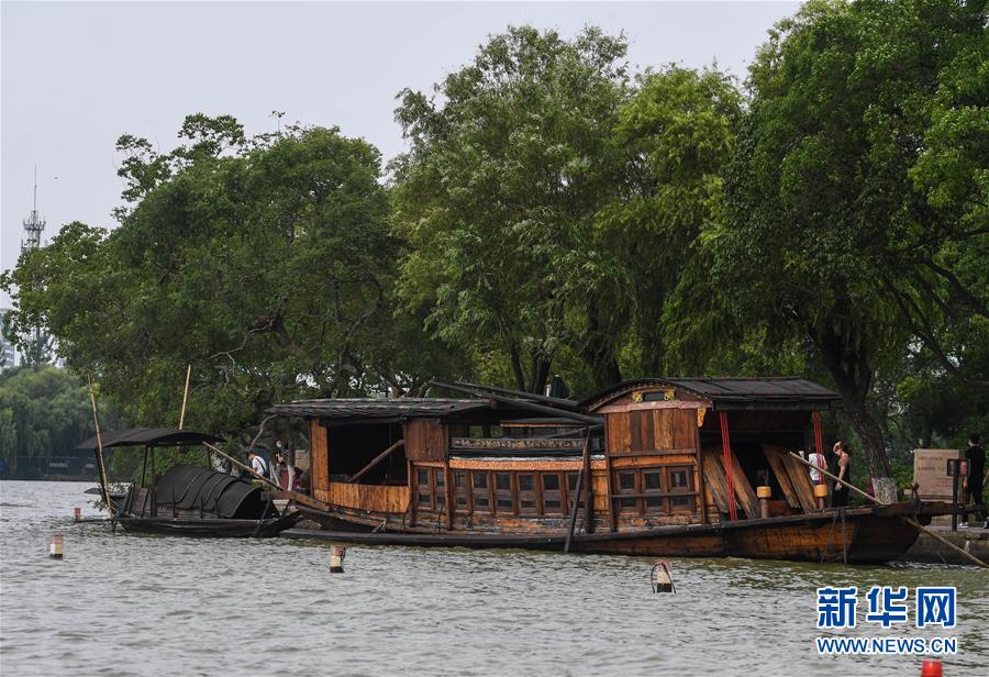 7月1日,嘉興南湖景區(qū)內停泊的中共一大紀念船。新華社記者徐昱攝