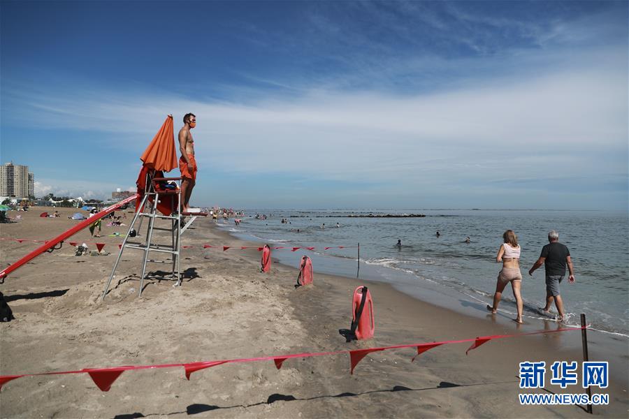 7月1日,救生員在美國(guó)紐約科尼島的一處海灘查看海面情況。當(dāng)日,美國(guó)紐約市屬八處海灘正式重新準(zhǔn)許民眾游泳,救生員也同時(shí)上崗。新華社記者王迎攝