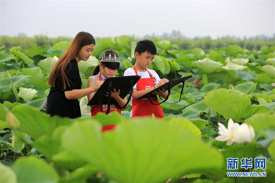 7月3日,游客在曲周縣勝豐蓮藕種植專(zhuān)業(yè)合作社荷塘景區(qū)寫(xiě)生。時(shí)值夏日,河北省曲周縣勝豐蓮藕種植專(zhuān)業(yè)合作社荷塘景區(qū)的荷花競(jìng)相綻放,吸引眾多游人前來(lái)觀光游覽。新華社記者 王曉 攝