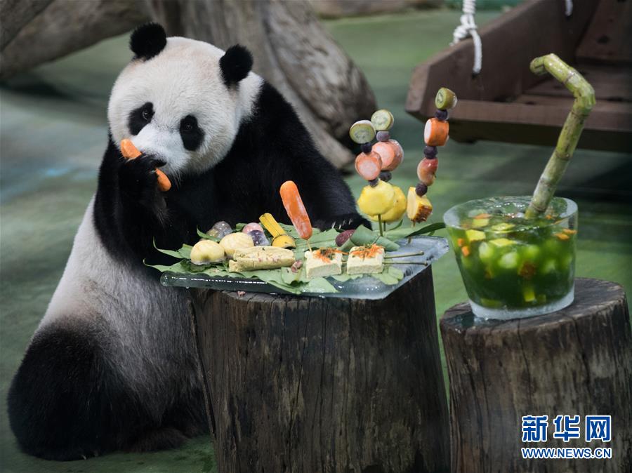 7月6日,在臺北市立動物園,大熊貓“圓仔”正在品嘗特制的生日蛋糕。新華社記者金立旺攝