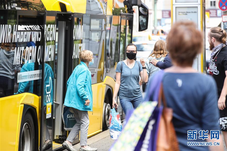 7月7日,乘客在德國首都柏林的一處公交車站候車。針對有地方官員呼吁取消民眾乘坐公交車和在商場購物時須戴口罩的規(guī)定,德國聯(lián)邦政府6日表示,支持延續(xù)“口罩強制令”。4月底,德國全部16個聯(lián)邦州陸續(xù)出臺“口罩強制令”,即居民在乘坐公交車和購物時須佩戴口罩。新華社記者單宇琦攝