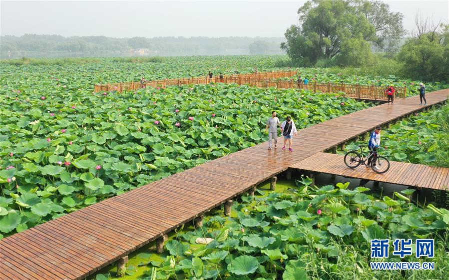 7月7日,游客在唐山市南湖公園欣賞盛開的荷花。近日,河北省唐山市南湖公園內荷花競相綻放,呈現(xiàn)出“接天蓮葉無窮碧,映日荷花別樣紅”的美麗景象,吸引了眾多游客前來觀賞。新華社記者楊世堯攝