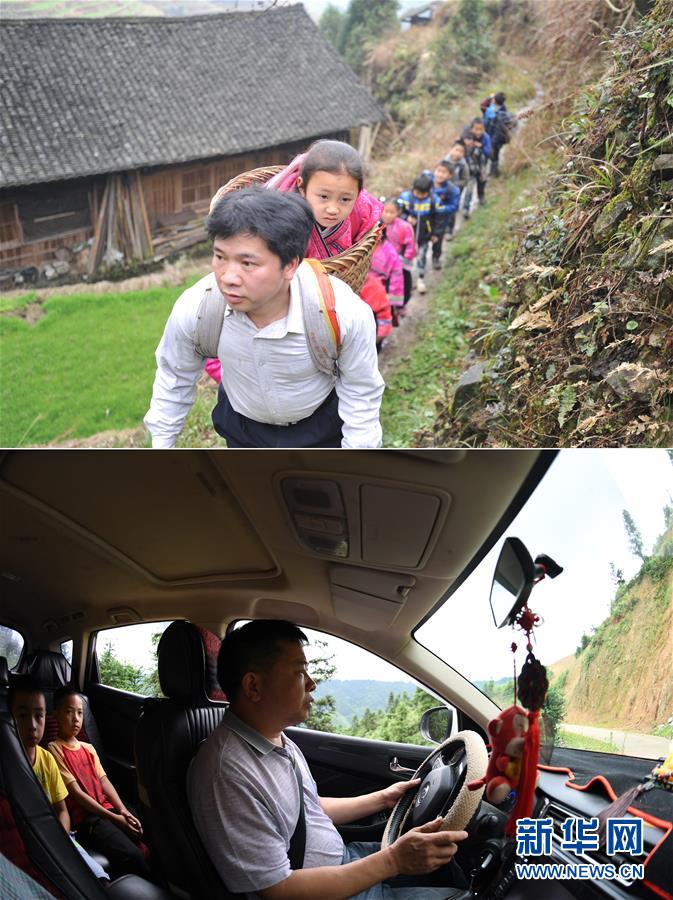 這是一張拼版照片,上圖:在廣西龍勝龍脊鎮(zhèn)江柳村,余啟貴老師背著背簍領(lǐng)著學(xué)生去學(xué)校(2013年2月26日攝);下圖:在廣西龍勝龍脊鎮(zhèn)江柳村,余啟貴老師開著自己的汽車帶著學(xué)生去學(xué)校(7月7日攝)。新華社記者陸波岸攝