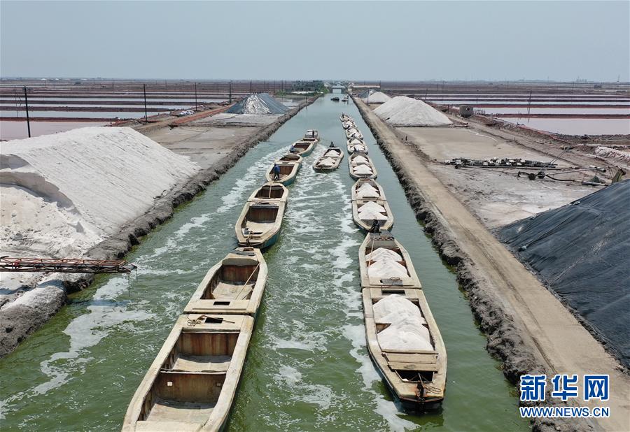 7月9日,唐山市曹妃甸區(qū)南堡鹽場的運鹽船只在運輸河道內(nèi)行駛(無人機照片)。在我國長蘆鹽區(qū)海鹽生產(chǎn)基地之一的河北省唐山市曹妃甸區(qū)南堡鹽場,一年一度的春鹽收獲工作即將結(jié)束,今年南堡鹽場的春鹽產(chǎn)量預計可達72萬噸。新華社記者楊世堯攝