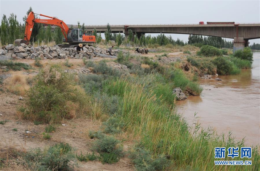 7月11日,工人在黃河內(nèi)蒙古磴口段南套子險工段進行除險加固。新華社記者李云平攝