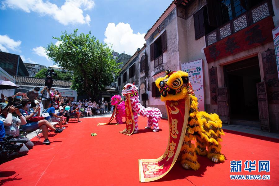 7月11日,演員在“慶祝澳門歷史城區(qū)申遺成功15周年嘉年華”上表演舞獅。新華社記者張金加攝