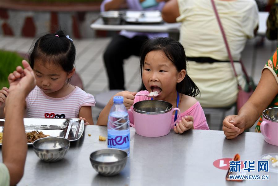 7月14日,小朋友在宿松縣洲頭鄉(xiāng)中心小學(xué)集中安置點吃晚餐。近日,安徽省宿松縣洲頭鄉(xiāng)泗洲村的300多名村民因洪水被轉(zhuǎn)移到該鄉(xiāng)中心小學(xué)集中安置點。安置點工作人員、志愿者利用學(xué)校食堂為村民們烹飪飯菜,讓村民們在安置點吃上熱騰騰的三餐。新華社記者 劉軍喜 攝