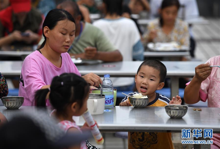 7月14日,小朋友在宿松縣洲頭鄉(xiāng)中心小學(xué)集中安置點吃晚餐。近日,安徽省宿松縣洲頭鄉(xiāng)泗洲村的300多名村民因洪水被轉(zhuǎn)移到該鄉(xiāng)中心小學(xué)集中安置點。安置點工作人員、志愿者利用學(xué)校食堂為村民們烹飪飯菜,讓村民們在安置點吃上熱騰騰的三餐。新華社記者 劉軍喜 攝