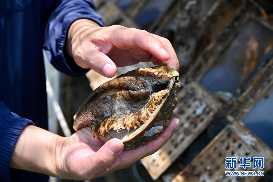 7月14日,在福建省連江縣深遠(yuǎn)海養(yǎng)殖平臺“福鮑一號”上,工作人員展示長勢良好的鮑魚。新華社記者 姜克紅 攝