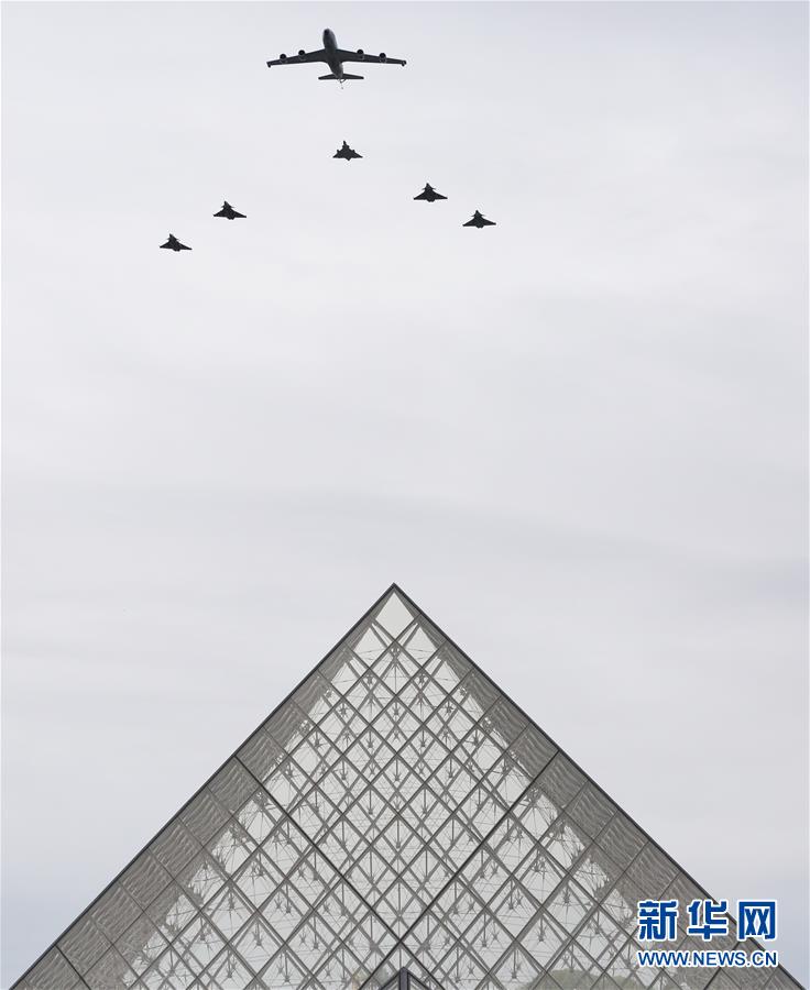 7月14日,在法國(guó)巴黎舉行的國(guó)慶閱兵式上,法國(guó)空軍飛機(jī)飛過(guò)盧浮宮玻璃金字塔。新華社記者高靜攝