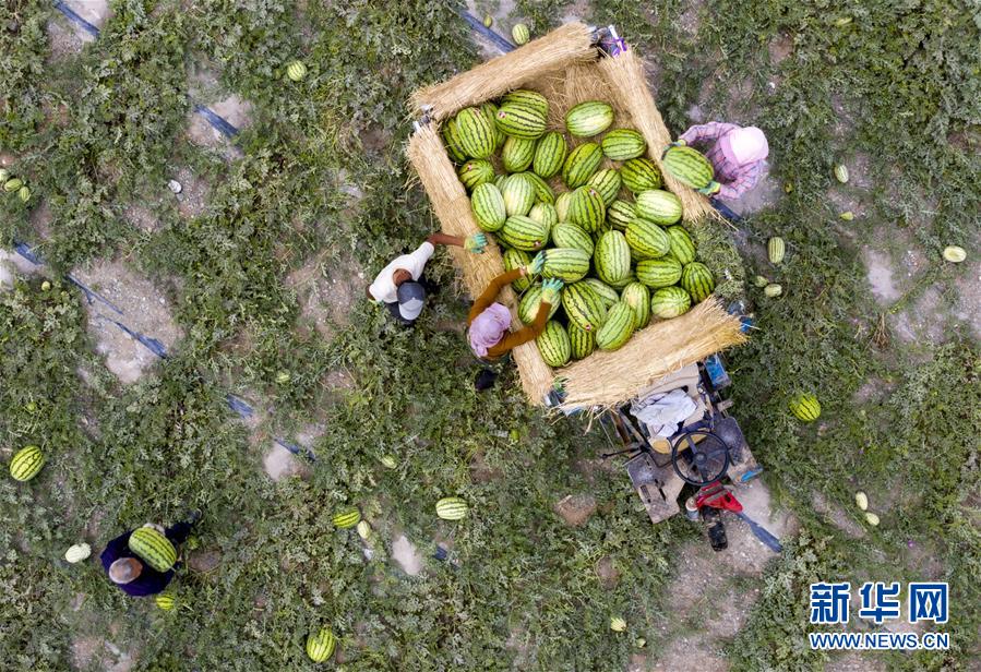 7月16日,在寧夏中衛(wèi)市香山鄉(xiāng)硒砂瓜萬(wàn)畝示范基地,瓜農(nóng)將采收的西瓜裝車(無(wú)人機(jī)照片)。近日,寧夏中衛(wèi)市迎來(lái)硒砂瓜豐收季。硒砂瓜是中衛(wèi)市的特色農(nóng)產(chǎn)品,近年來(lái),當(dāng)?shù)夭扇〖夹g(shù)創(chuàng)新、規(guī)?;N植、休耕輪作等多項(xiàng)舉措,讓硒砂瓜種植成為當(dāng)?shù)剞r(nóng)民增收致富的重要產(chǎn)業(yè)。據(jù)了解,今年中衛(wèi)市硒砂瓜種植面積為69.7萬(wàn)畝。新華社記者楊植森攝