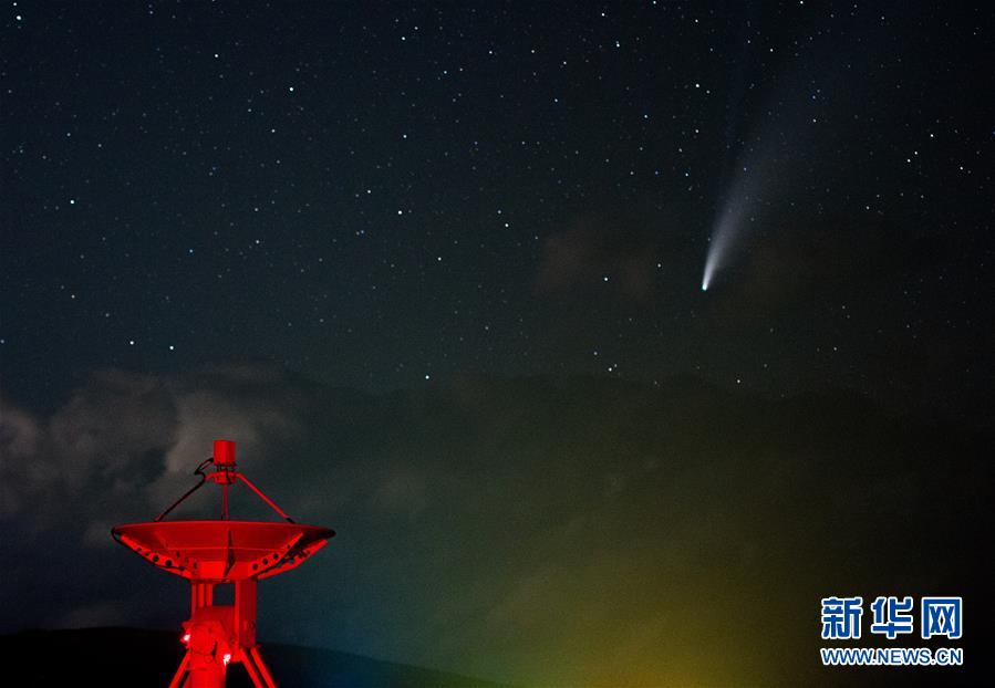 7月18日晚,在明安圖觀測基地,尼歐懷茲彗星劃過天際。7月18日晚至19日凌晨,在位于內蒙古錫林郭勒盟正鑲白旗境內的國家天文臺明安圖觀測基地,尼歐懷茲彗星劃過天際。在明安圖觀測基地內,排列著100面白色的拋物面天線。這個龐大的天線陣列便是草原“天眼”——明安圖射電頻譜日像儀。草原“天眼”持續(xù)接收太陽射電輻射,然后由科研人員進行數(shù)據(jù)分析研究,對空間環(huán)境監(jiān)測、太陽活動預報均有重要作用。新華社記者連振攝