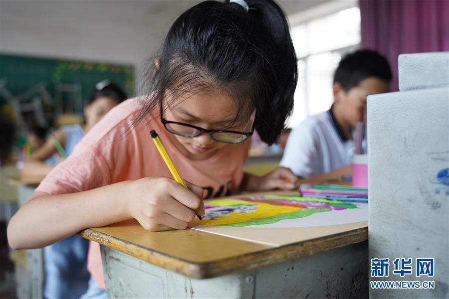 7月23日,在廬山市蛟塘鎮(zhèn)中心小學(xué)安置點(diǎn),小朋友在美術(shù)課上繪畫。