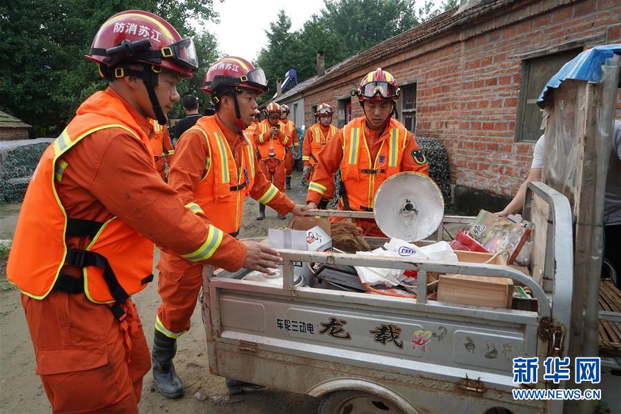 7月23日,淮安市消防救援支隊(duì)隊(duì)員在盱眙縣鮑集鎮(zhèn)新遷村幫助村民轉(zhuǎn)移車(chē)輛。當(dāng)日,受淮河盱眙段水位上漲影響,江蘇省淮安市盱眙縣啟動(dòng)鮑集圩行洪區(qū)萬(wàn)余名群眾撤離轉(zhuǎn)移工作,確保安全度汛。新華社記者韓瑜慶攝