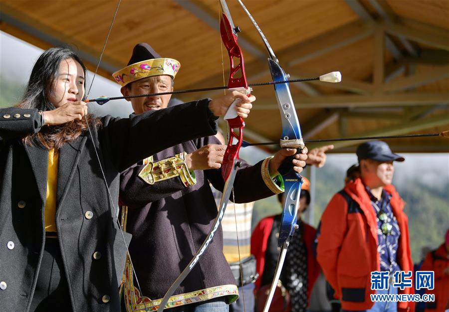 一名游客在當(dāng)?shù)剞r(nóng)牧民的指導(dǎo)下射擊響箭(7月26日攝)。新華社記者 張汝鋒 攝