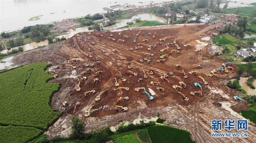 7月28日,在姜唐湖蓄洪區(qū)戴家湖一處涵閘險(xiǎn)情處置現(xiàn)場(chǎng),人們操作機(jī)械設(shè)備在搶筑臨時(shí)圩堤(無(wú)人機(jī)照片)。新華社記者張端攝