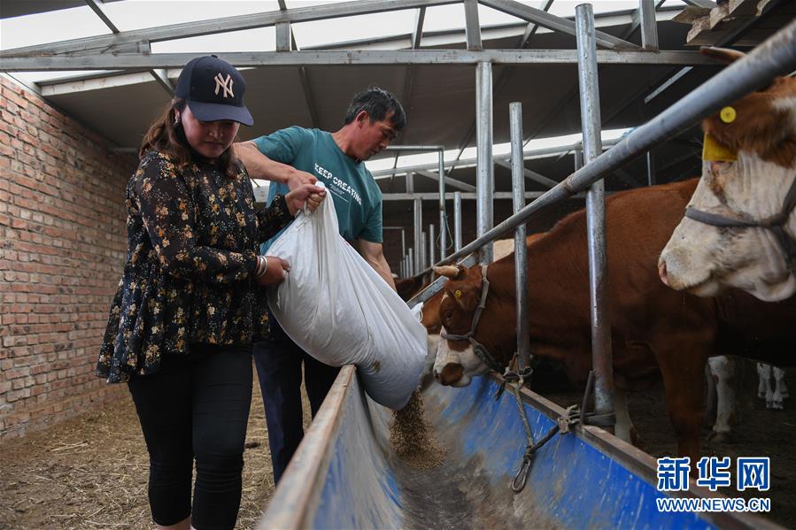 呼格吉勒(后)和妻子薩如拉在自家牛舍給牛喂飼料(7月23日攝)。新華社記者劉磊攝