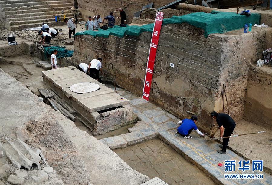工作人員在河南省開(kāi)封市州橋及附近汴河遺址進(jìn)行清理發(fā)掘(7月27日攝)。新華社記者李安攝