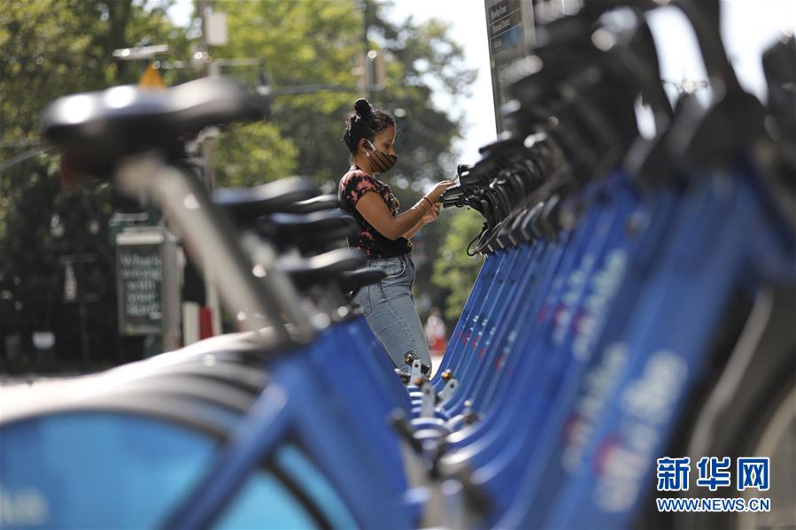 7月29日,在美國紐約,一名女子準(zhǔn)備取用共享單車。美國約翰斯·霍普金斯大學(xué)實時統(tǒng)計數(shù)據(jù)顯示,截至29日,美國累計新冠確診病例已超過440萬例,累計死亡病例超過15萬例。新華社記者王迎攝