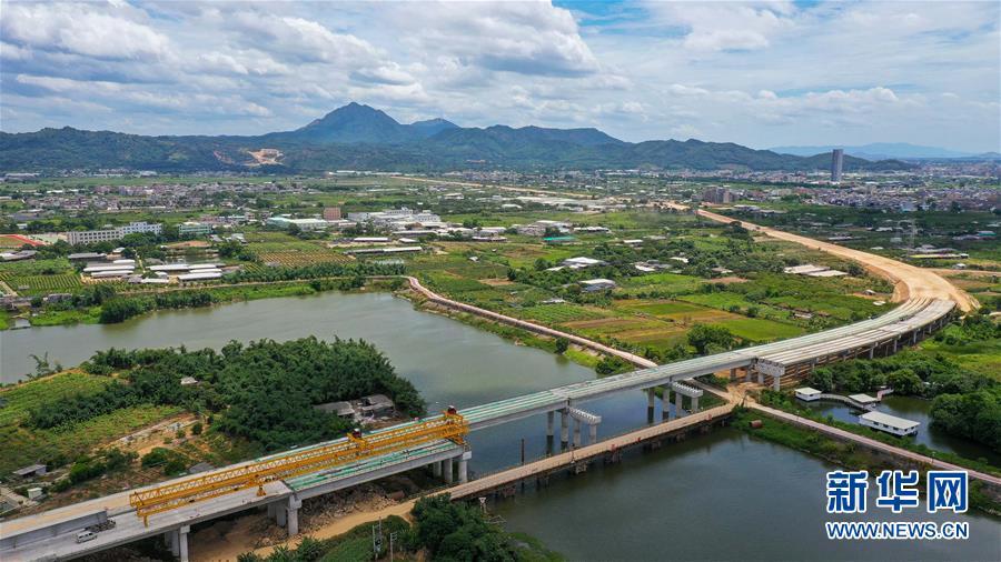 潮汕環(huán)線高速公路北溪河橋正在架梁(無人機照片,7月31日攝)。新華社記者劉大偉攝