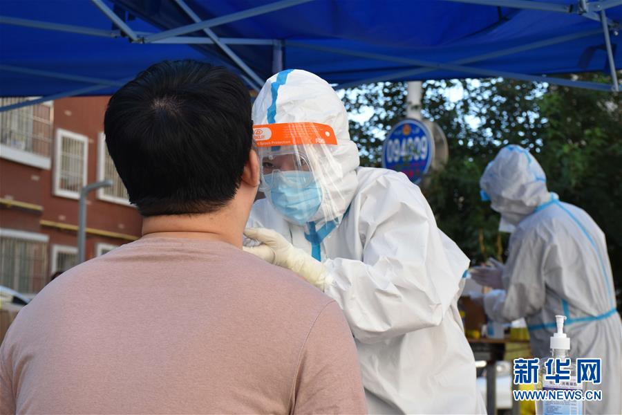 8月5日,醫(yī)務工作者在烏魯木齊市天山區(qū)山西巷社區(qū),對居民開展免費核酸檢測服務。新華社記者高晗攝