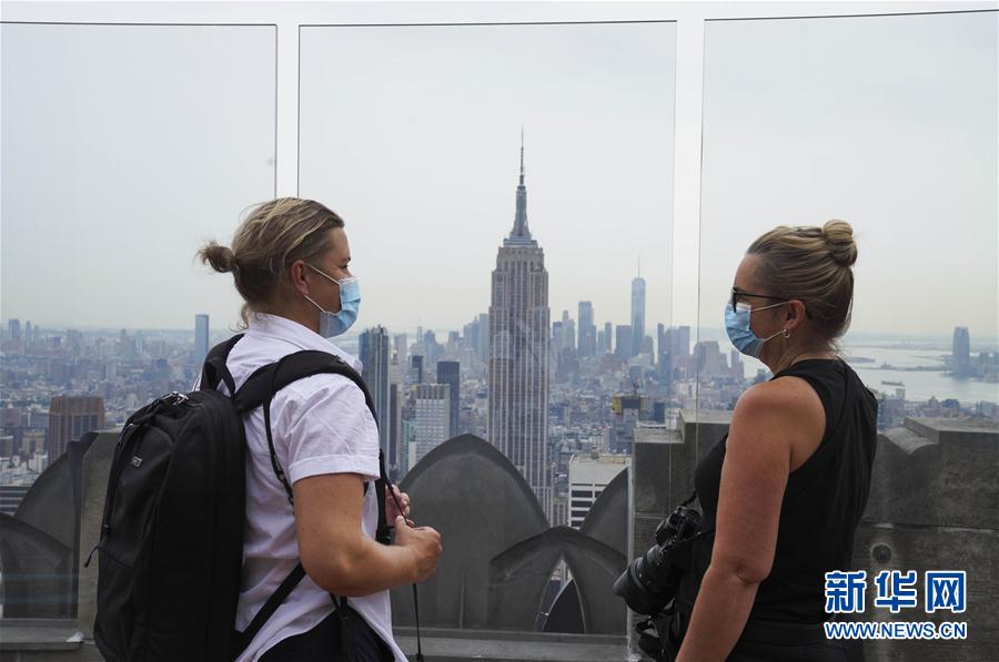 8月6日,在美國紐約,人們在洛克菲勒中心觀景臺上觀看城市景觀。當日,3月份暫時關(guān)閉的洛克菲勒中心觀景臺恢復(fù)對公眾開放。每天13時至21時,人們可戴口罩前往參觀。新華社記者王迎攝