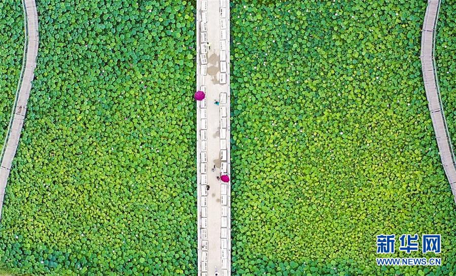 8月6日,游客在河北省永清縣里瀾城鎮(zhèn)金華湖觀賞荷花(無(wú)人機(jī)照片)。夏日時(shí)節(jié),河北省永清縣里瀾城鎮(zhèn)金華湖荷塘的荷花爭(zhēng)相開(kāi)放,吸引市民和游客前來(lái)游玩觀賞。新華社記者李曉果攝