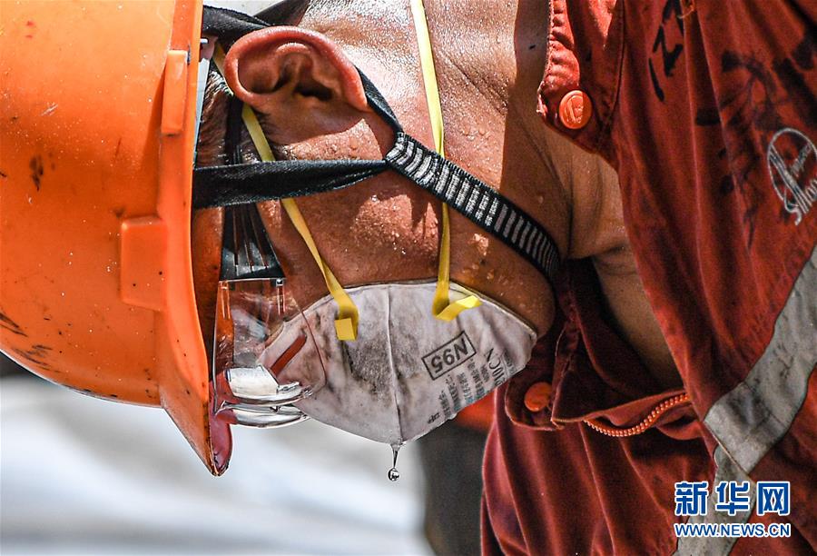 7月27日,在位于南海北部海域的勘探三號鉆井平臺上,一名鉆井工人在作業(yè)時汗水浸透了口罩。新華社記者蒲曉旭攝
