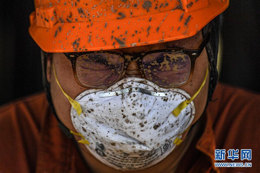 7月27日,在位于南海北部海域的勘探三號鉆井平臺上,一名鉆井工人在作業(yè)時眼鏡和口罩沾滿了泥漿。新華社記者蒲曉旭攝