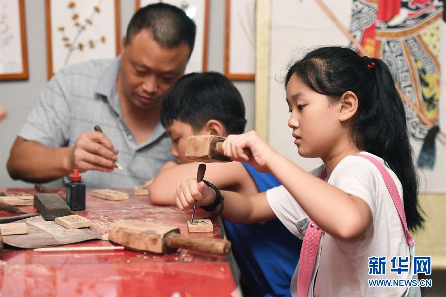 8月8日,小朋友在長(zhǎng)沙市非物質(zhì)文化遺產(chǎn)展示館體驗(yàn)望城新康木雕技藝。新華社記者 薛宇舸 攝