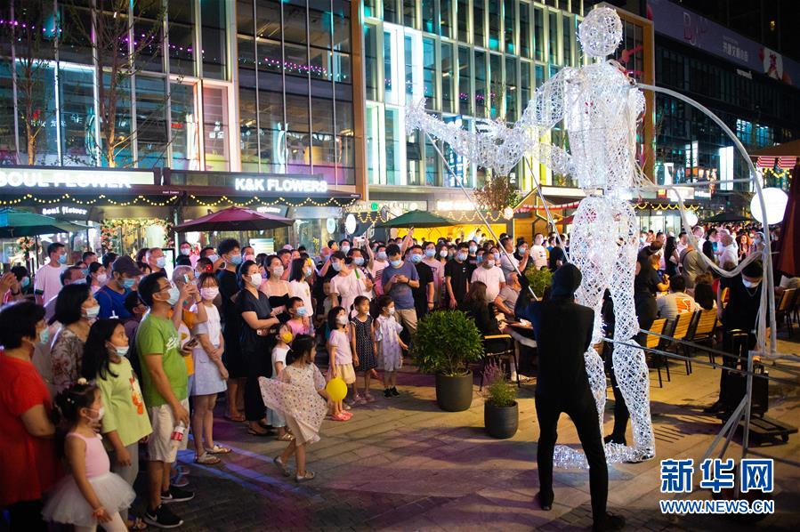 8月8日晚,市民在望京小街商業(yè)街觀看巨型人偶表演。當(dāng)日,作為北京消費(fèi)季活動(dòng)的一部分,北京市朝陽區(qū)的“潮朝陽”消費(fèi)季活動(dòng)正式重啟,位于朝陽區(qū)的新興商業(yè)街望京小街舉辦開街嘉年華活動(dòng)。新華社記者 陳鐘昊 攝