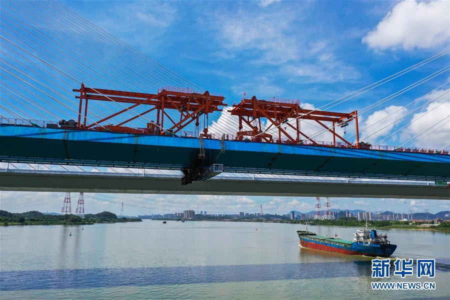 8月9日拍攝的廣州南沙港鐵路跨西江特大斜拉橋最后一塊鋼箱梁吊裝施工現(xiàn)場(chǎng)(無人機(jī)照片)。當(dāng)日,中鐵十一局承建的粵港澳大灣區(qū)基礎(chǔ)設(shè)施“硬聯(lián)通”重點(diǎn)工程——廣州南沙港鐵路跨西江特大斜拉橋完成最后一塊鋼箱梁吊裝作業(yè),大橋即將合龍。該橋位于廣東佛山市和江門市交界處,全長1117.5米。新華社記者劉大偉攝。