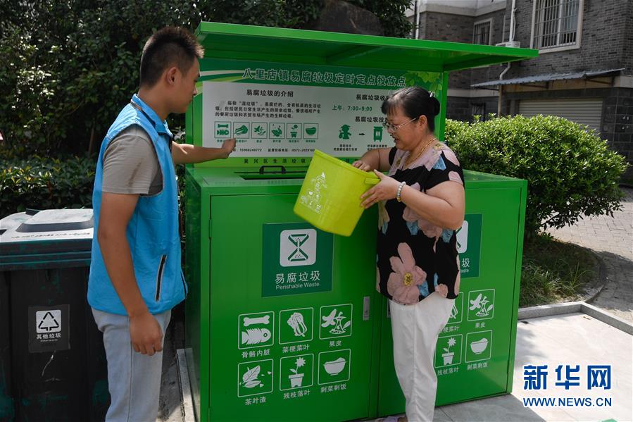8月9日,湖州市吳興區(qū)八里店鎮(zhèn)百合苑居民(右)投放易腐垃圾。近年來,浙江省通過創(chuàng)新宣傳教育,多措并舉促進垃圾分類投放、收運及處置的良性循環(huán),引領(lǐng)垃圾分類成為城鄉(xiāng)居民的生活新風(fēng)尚。新華社記者黃宗治攝。