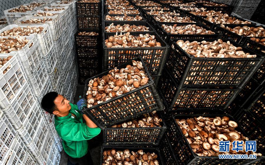陜西漢中市留壩縣武官驛鎮(zhèn)留香益品商貿(mào)公司的員工在擺放冷庫(kù)里的香菇(7月2日攝)。陜西留壩縣是陜西西南部的特色農(nóng)業(yè)產(chǎn)業(yè)縣,近年來(lái)在推進(jìn)產(chǎn)業(yè)富民的過(guò)程中,開辟出一條“政府+龍頭企業(yè)+扶貧社+農(nóng)戶”的訂單產(chǎn)業(yè)發(fā)展道路,把農(nóng)戶綁在產(chǎn)業(yè)鏈上,持續(xù)帶動(dòng)農(nóng)業(yè)增效、農(nóng)民增收。新華社記者劉瀟攝。