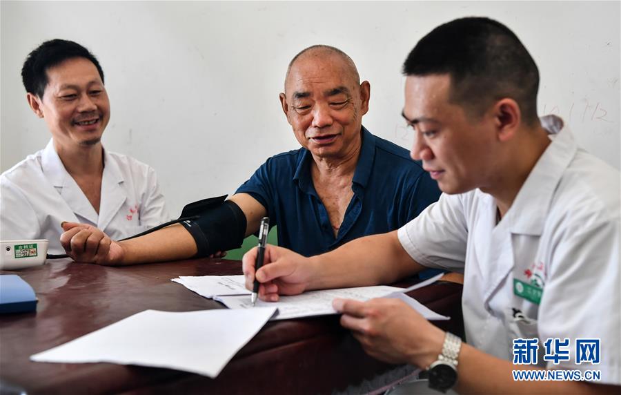 陜西安康市嵐皋縣佐龍鎮(zhèn)中心衛(wèi)生院的醫(yī)生在佐龍村對家庭醫(yī)生簽約服務(wù)對象進(jìn)行慢性病隨訪(7月30日攝)。目前,嵐皋縣組建了71個鎮(zhèn)級家庭醫(yī)生服務(wù)團(tuán)隊(duì)、15個縣級技術(shù)指導(dǎo)團(tuán)隊(duì),對貧困群眾開展重點(diǎn)人群免費(fèi)體檢、慢病隨訪、健康生活指導(dǎo)、健康扶貧政策宣傳等簽約服務(wù)項(xiàng)目。新華社記者劉瀟攝。