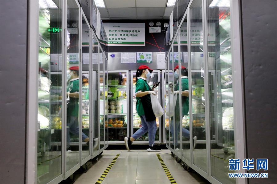 工作人員在叮咚買菜一家前置倉內(nèi)為網(wǎng)絡(luò)訂單配貨(7月17日攝)。近年來,在上海崛起了一批以盒馬、叮咚、拼多多為代表的在線經(jīng)濟新力量,在助力脫貧攻堅、提升城市居民品質(zhì)生活方面發(fā)揮著重要作用。電商加持下的“云農(nóng)業(yè)”加速發(fā)展,一端為市民提供更便宜新鮮的農(nóng)產(chǎn)品,另一端讓山區(qū)的優(yōu)質(zhì)產(chǎn)品加速進入城市餐桌,化解交通不便、農(nóng)產(chǎn)品滯銷等問題。新華社記者方喆攝。