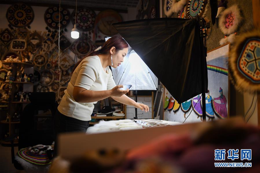 在內蒙古自治區(qū)鄂溫克族自治旗巴彥托海鎮(zhèn)太陽花傳承發(fā)展中心,艾吉瑪在拍攝手工藝品照片(8月7日攝)。新華社記者劉磊攝。