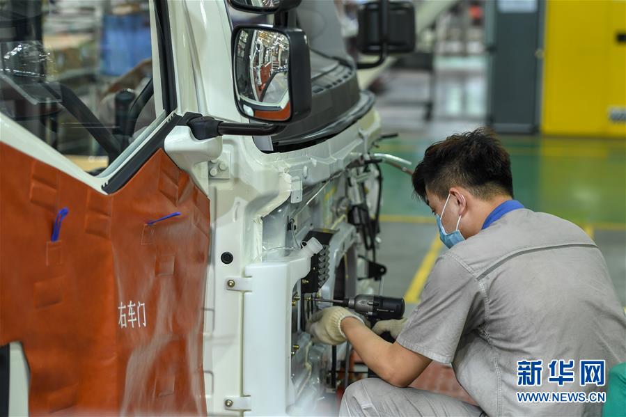 8月10日,在位于長春市的一汽解放總裝車間,工人在裝配車輛。中國第一汽車集團(tuán)有限公司7月銷售整車32.2萬輛,同比增長23.2%,延續(xù)上半年的增長態(tài)勢。新華社記者張楠攝。