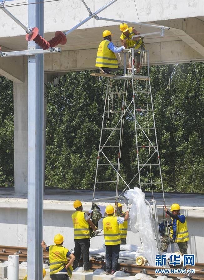 8月10日,工人在京雄城際鐵路霸州北站建設(shè)工地為接觸網(wǎng)卡定位。京雄城際鐵路霸州北站站臺(tái)雨棚混凝土結(jié)構(gòu)施工日前全部完成,目前霸州北站已全面轉(zhuǎn)入裝飾裝修和機(jī)電安裝階段,預(yù)計(jì)2020年底投入使用。京雄城際鐵路是連接北京市區(qū)、大興機(jī)場(chǎng)和雄安新區(qū)的重要干線。建成后,將進(jìn)一步完善京津冀區(qū)域高速鐵路網(wǎng)結(jié)構(gòu),便利沿線群眾出行,對(duì)于推動(dòng)京津冀協(xié)同發(fā)展和支撐建設(shè)雄安新區(qū)具有重要意義。新華社記者李曉果攝。