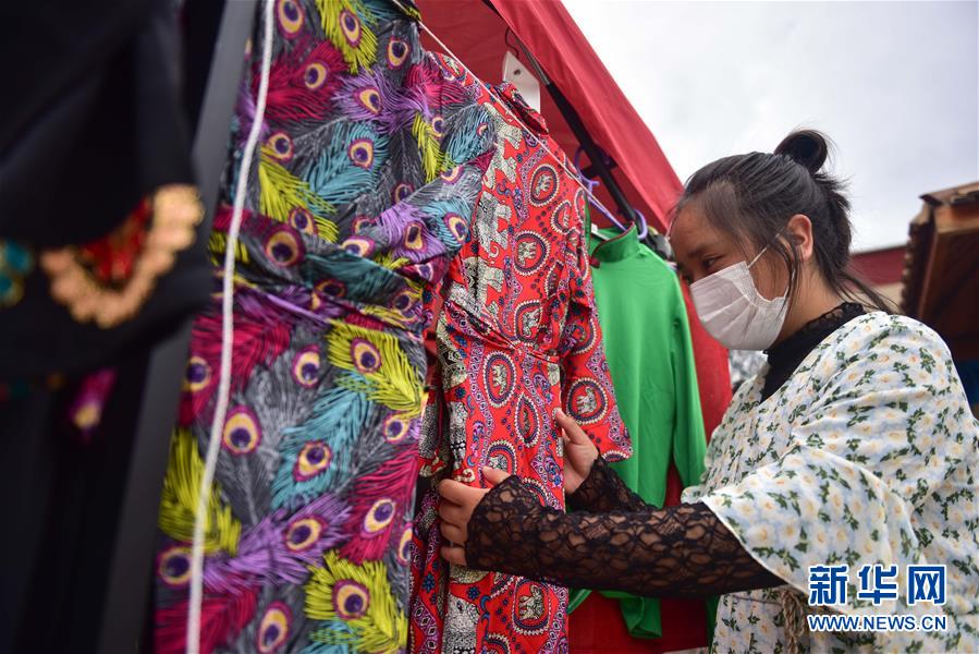 8月11日,尖扎縣昂拉鄉(xiāng)德吉村村民在自家經(jīng)營(yíng)的藏裝店內(nèi)整理服裝。新華社記者張龍攝