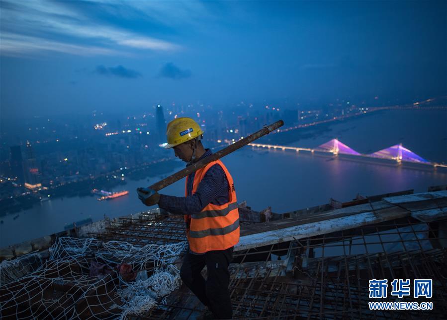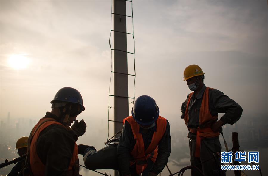 8月11日傍晚,工人在武漢綠地中心項(xiàng)目建設(shè)現(xiàn)場(chǎng)近500米的高空施工。新華社記者肖藝九攝