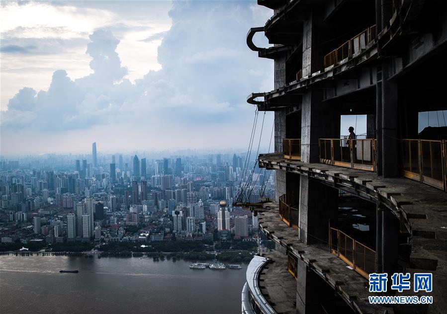 8月11日,一名工人在武漢綠地中心項目建設(shè)現(xiàn)場近500米的高空遠眺。新華社記者肖藝九攝