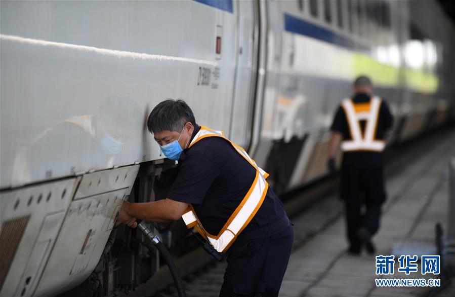 8月12日,長春火車站客運車間上水工王軍在給列車上水。進入暑運高峰,為了保障列車正常用水,每當(dāng)一列火車停靠車站,長春火車站的上水工就冒著酷暑將水管插進火車底部的輸水口,快速準(zhǔn)確完成輸水作業(yè)。新華社記者 林宏 攝
