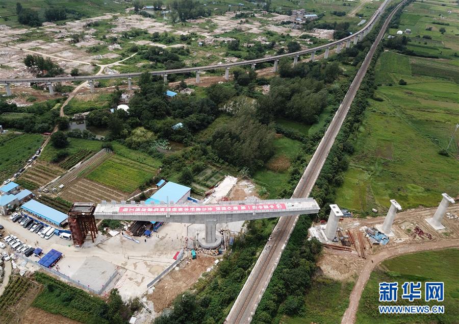 這是8月12日拍攝的水蚌鐵路蚌埠段改線工程東站疏解線特大橋跨越京滬鐵路上行線轉體梁轉體施工現場(無人機照片)。當日,由中鐵一局承建的水蚌鐵路蚌埠段改線工程東站疏解線特大橋跨越京滬鐵路上行線64米T構轉體梁成功實現轉體。新華社記者 劉軍喜 攝