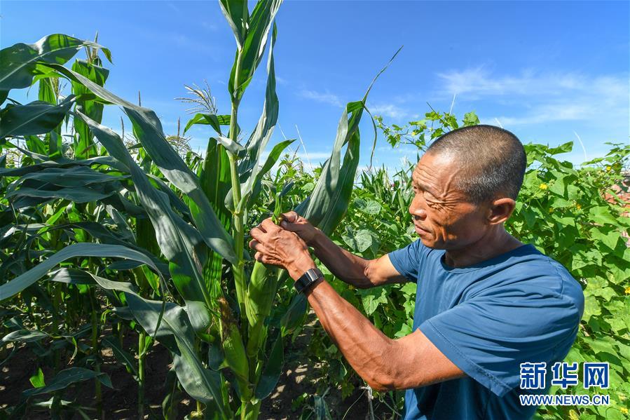 8月12日,在鎮(zhèn)賚縣黑魚(yú)泡鎮(zhèn)岔臺(tái)村,村民曲海波查看玉米長(zhǎng)勢(shì)。新華社記者 張楠 攝