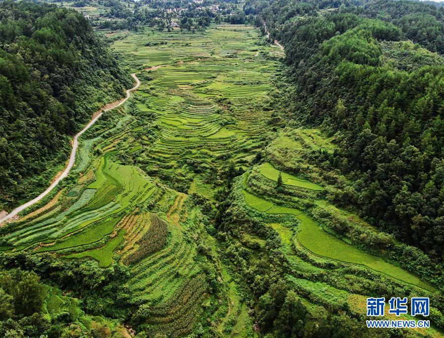 這是8月13日拍攝的鞍子鎮(zhèn)大林村梯田景色。時下,重慶市彭水苗族土家族自治縣鞍子鎮(zhèn)大林村的梯田景色迷人,構(gòu)成一幅幅山鄉(xiāng)田園美景。新華社記者王全超攝
