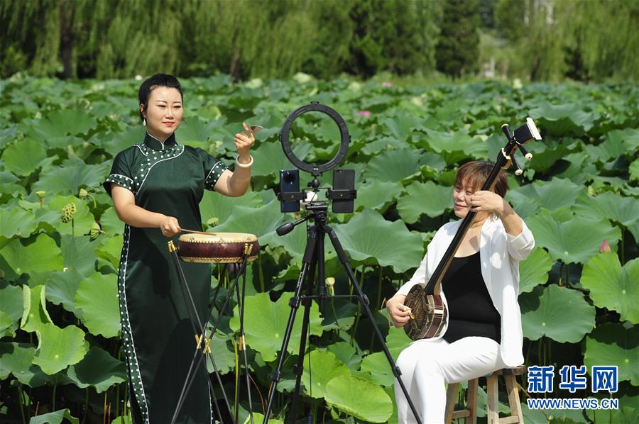 8月13日,河北省河間市西河大鼓非遺項目藝人李雪(左)、張領(lǐng)娣通過網(wǎng)絡(luò)直播表演西河大鼓。暑假期間,河北省河間市文化館推出非遺展演“云端”播系列活動,組織當(dāng)?shù)匚骱哟蠊姆沁z項目傳承人利用視頻直播的方式進行線上展演,通過“云端”傳承非遺文化。新華社記者朱旭東攝