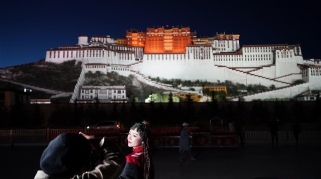 夜幕降臨,西藏拉薩布達(dá)拉宮燈光璀璨,夜景迷人。