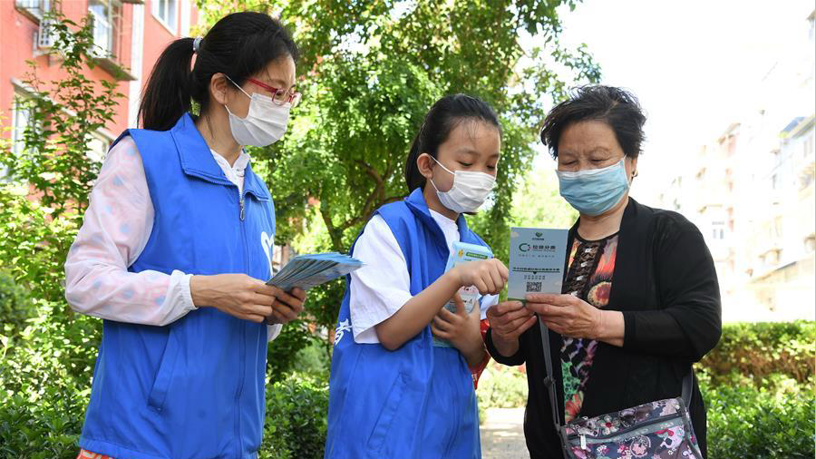 在北京市海淀區(qū)中關村街道青云北社區(qū),胡欣然(中)與社區(qū)工作人員(左)一起為社區(qū)居民發(fā)放垃圾分類宣傳手冊。