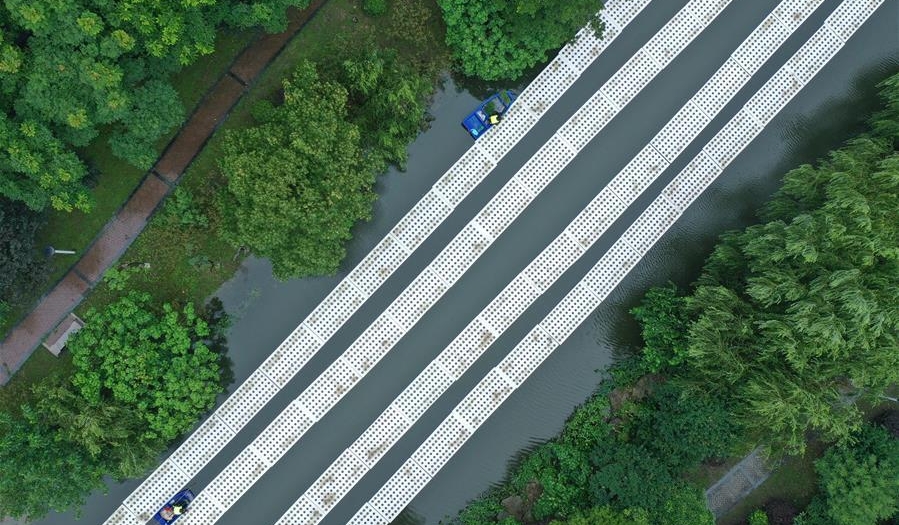 在益陽(yáng)市大通湖區(qū)東大堤附近水域,一艘船采取“以船代倉(cāng)”方式儲(chǔ)備防汛物資。